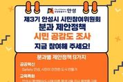 어웨이크뉴스 오경하 기자 | 안성시는 오는 18일 오후 6시까지 시민참여위원회 분과별 제안 정책에 대한 시민 의견을 수렴한다고 밝혔다. 이번 시민 의견 수렴은 시민참여위원회 정책 발표회를 앞두고 진행하는 사전심사로, 분과별 제안 정책에 대한 시민 공감도를 확인하여 추후 현장심사 결과와 함께 최종 우수 제안 정책을 선정하는 데 활용된다. 7개 분과로 구성된 안성시 시민참여위원회는 소속 위원의 다양한 경험과 지속적인 논의를 바탕으로 안성시 시정에 반영할 정책 연구 활동을 추진해 왔으며, 이달 정책 발표회를 통해 각 분과에서 도출한 정책을 제안하여 그간 활동의 결실을 맺을 예정이다. 정책 발표회를 통해 각 분과에서 제안할 정책 주제는 ▲Safety 안성, 시민이 안전한 도시 만들기(공공혁신분과) ▲안성시 평생학습도시에 따른 평생교육 강사 플랫폼 구축(교육특화분과) ▲안성시 한우산업 탄소중립 모니터링 시스템 구축(미래농업분과) ▲안성시민을 위한 태양광발전 5개년 계획(생태도시분과) ▲전통문화 예술인들을 위한 창작공간 확보(문화도시분과) ▲안성, 사랑 흔들바위 관광지 조성(문화도시분과) ▲더불어 이동하는 자유로운 안성(