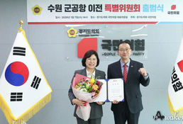 ▲백현종 대표의원, 특별위원장에 이애형 의원 임명 어웨이크뉴스 오경하 기자 | 경기도의회 국민의힘(대표의원 백현종)은 7일 ‘수원 군공항 이전 특별위원회’를 출범하고 특별위원장에 이애형(수원10) 의원을 임명했다. 이날 경기도의회 국민의힘 대표의원실에서 열린 ‘경기도의회 국민의힘 수원 군공항 이전 특별위원회’ 출범식에는 백현종 대표의원과 이애형 특별위원장을 비롯해 국민의힘 소속 도의원들이 다수 참석했다. ‘경기도의회 국민의힘 수원 군공항 이전 특별위원회’는 민관(民官) 가교 역할을 통해 수원 군공항 이전 계획을 체계적으로 수립하고 효과적으로 추진하고자 출범했다. 수원시 권선구 세류동 일원에 위치한 군공항은 과거 2차 세계대전 당시 일본군이 비행장으로 처음 건설했고, 현재 공군 제10전투비행단이 주둔해 있다. 오랜 기간 전투기 소음과 고도제한 등으로 주민 불편이 지속되고 도시 발전에도 영향을 끼친다는 지적이 잇따르자, 이전 문제가 지역 최대 현안으로 떠오르게 됐다. 최근에는 광주 군·민간 공항의 무안 통합 이전 합의, 수원 지역 정치권의 이전 촉구 건의문 국방부 전달 등과 맞물리면서 관련 논의가 재점화하는 분위기다. ‘경기도의회 국민의힘 수원 군공항 이전 특별