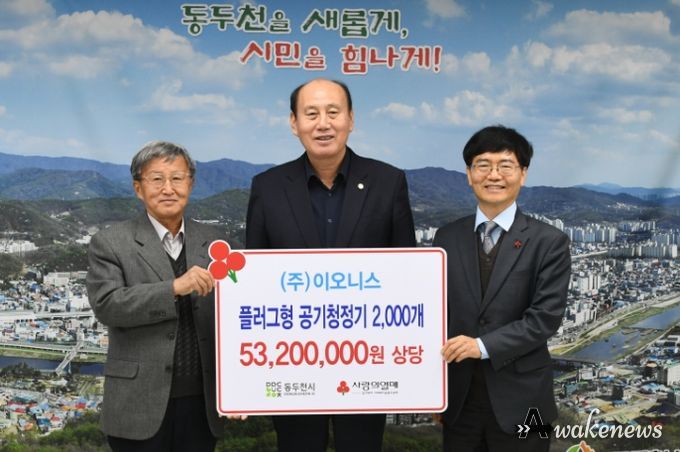어웨이크뉴스 오경하 기자 | 지난 28일 동두천시는 ㈜이오니스로부터 5,320만 원 상당의 플러그형 공기청정기 2,000개를 이웃 돕기 성품으로 전달받았다고 전했다.