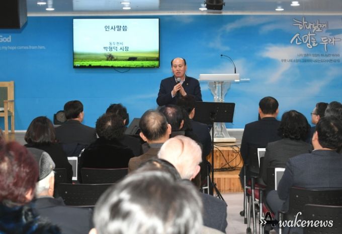 어웨이크뉴스 오경하 기자 | 동두천시 기독교연합회는 23일 동성교회에서 박형덕 동두천시장, 김성원 국회의원, 김승호 시의회 의장, 도의원 및 시의원, 이상훈 장로연합회장, 동두천 관내 교회 목사 등 100여 명이 참석한 가운데 시정발전기도회를 가졌다.