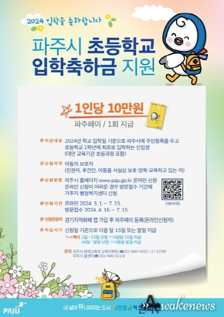 어웨이크뉴스 오경하 기자 | 파주시는 초등학교 1학년에 들어가는 입학생이 있는 모든 가정에 입학 축하의 의미를 담은 입학축하금을 지급한다.