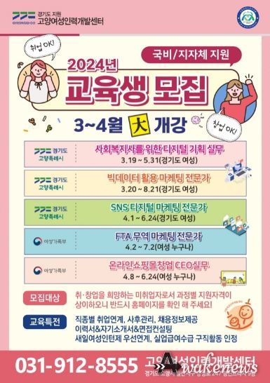 어웨이크뉴스 오경하 기자 | 고양여성인력개발센터는 경제활동을 원하는 여성 구직자들의 취·창업지원을 위해 2024년 상반기 대규모 국비지원 교육생을 모집한다.