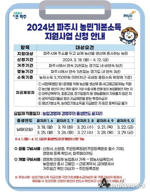 어웨이크뉴스 오경하 기자 | 파주시는 3월 18일부터 4월 12일까지 ‘2024년 농민기본소득 지원사업’ 참여 신청을 받는다.