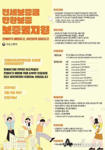 전세보증금반환보증 보증료 지원사업은 저소득층 주거 안정을 위해 전세 보증보험 가입자가 납부하는 보증료를 최대 30만원까지 지원하는 사업이다.
