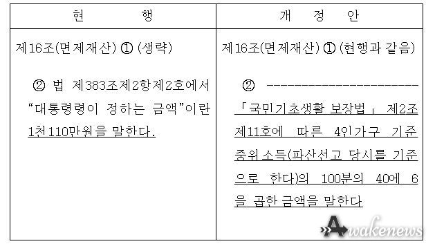 어웨이크뉴스 오경하 기자 | 현행 「채무자 회생 및 파산에 관한 법률」은 개인회생・파산절차를 이용하는 개인채무자의 최소한의 생활을 보장하기 위해, 채무 변제를 위하여 사용되는 매각 대상 재산에서 6개월간 생계비 명목으로 제외할 수 있는 재산의 상한 금액을 대통령령에 정하도록 위임하고, 동법 시행령은 그 상한을 ‘1,110만원’ 정액으로 규정하고 있다(채무자회생법 시행령 제16조 제2항).