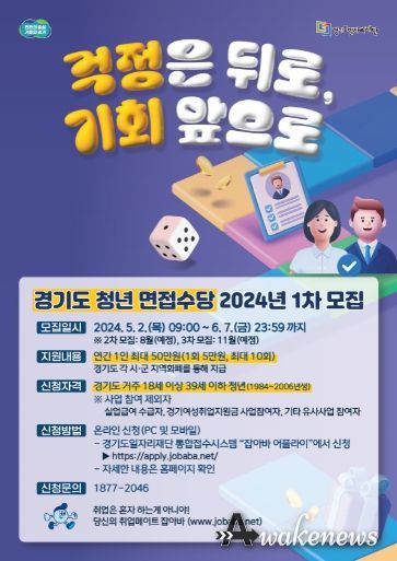 어웨이크뉴스 오경하 기자 | 경기도와 경기도일자리재단이 5월 2일부터 6월 7일까지 ‘2024년 청년면접수당 1차 모집’을 진행한다.