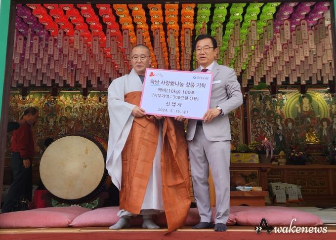 어웨이크뉴스 오경하 기자 | 지난 15일 하남시에 위치한 선법사에서 부처님 오신 날을 맞아 하남사랑愛나눔 성품으로 백미(10kg) 100포를 전달하고 기탁식을 가졌다.