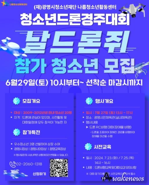 어웨이크뉴스 오경하 기자 | (재)광명시청소년재단 나름청소년활동센터는 2024년 청소년드론경주대회 [날드론쥐] 참가 청소년을 6월 29일 10시부터 광명시 2009년생 ~ 2012년생(초등6학년~중등3학년에 해당) 청소년을 대상으로 모집을 시작한다.