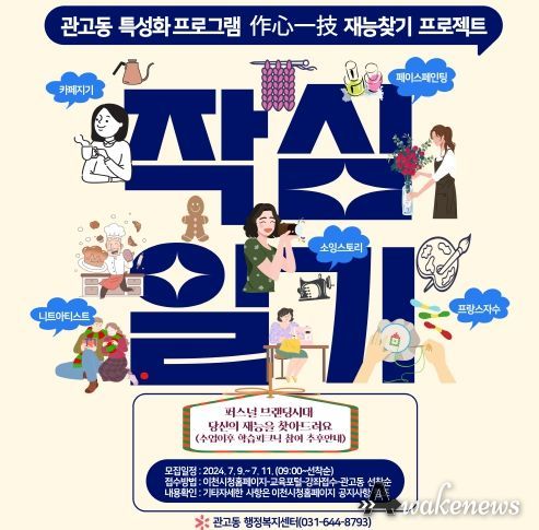 관고동 작심일기(作心一技) 프로젝트는 7월 공고 이후 5개의 문화예술영역 카페지기, 페이스페인팅, 니트아티스트, 소잉스토리, 프랑스자수 등 5회차 각 10명씩 50명을 모집 운영할 계획이며 수업이후 학습 피크닉을 운영 배움을 재능으로 연계하는 기회를 가질 계획으로 신청은 이천시청 홈페이지 교육포털을 통해 신청할 수 있다.