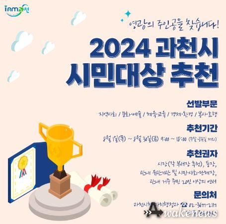 어웨이크뉴스 오경하 기자 | 과천시가 지역사회 발전에 헌신·봉사해 온 시민을 발굴하기 위해 ‘시민대상’ 후보자를 이달 30일까지 추천받는다.
