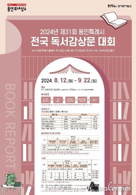 어웨이크뉴스 오경하 기자 | 용인특례시는 전 국민이 응모할 수 있는 2024년 제31회 전국 독서감상문 대회를 개최한다고 12일 밝혔다.