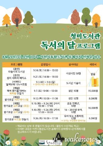 어웨이크뉴스 오경하 기자 | 이천시 청미도서관은 9월 한 달 동안 지역주민의 도서관 이용을 활성화하고 독서의 즐거움을 알리기 위해 ‘독서의 달’ 행사를 운영한다.