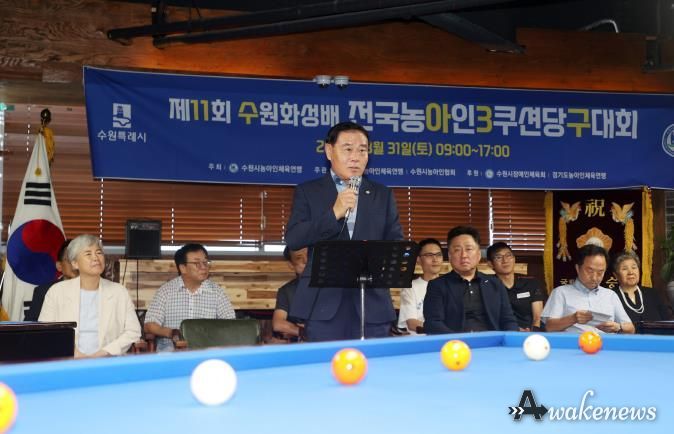어웨이크뉴스 오경하 기자 | 수원특례시의회가 31일 수원시 권선구 노블레스당구클럽에서 열린 2024년 제11회 수원화성배 전국농아인3쿠션당구대회 개최를 축하했다.