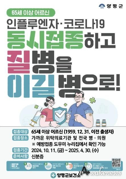 어웨이크뉴스 오경하 기자 | 양평군은 11일부터 65세 이상 어르신을 대상으로 지정 의료기관에서 독감(인플루엔자)·코로나19 예방 접종을 무료로 실시한다고 밝혔다.