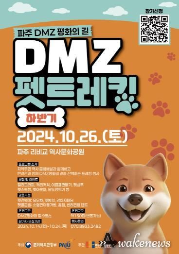 어웨이크뉴스 오경하 기자 | 파주시는 오는 26일 파평면 리비교 역사문화공원에서 ‘2024 파주 디엠지(DMZ) 평화의 길–디엠지(DMZ) 펫 트레킹(하반기)’ 행사를 개최한다.