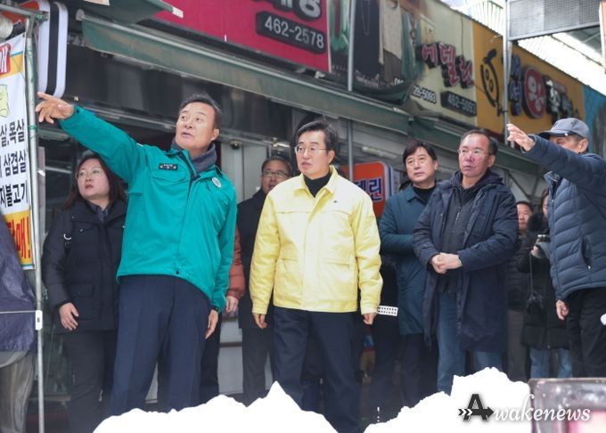 어웨이크뉴스 오경하 기자 | 김성제 의왕시장이 28일 폭설로 천장 그늘막이 무너진 의왕도깨비시장을 찾아 현장 점검과 피해 복구 작업에 나섰다.
