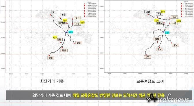 예를 들어 평일 화성시 봉담읍 수영리에서 사고가 발생했을 경우를 가정해 분석한 결과 단순 최단거리 기준인 호매실(7㎞), 서둔(7㎞), 팔탄(9㎞) 119센터 순으로 출동하게 되면 순서대로 21.6분, 20.5분, 16.9분이 걸린다. 그러나 교통 혼잡도를 반영해 출동 경로와 센터를 선정하면 호매실(8㎞), 반월(13㎞), 서둔(8㎞) 센터 순서로 14분, 14.4분, 14.7분이 걸리는 것으로 나타났다. 사고 지점에서 최단거리 조합으로 출동할 경우 평균 19.6분이 소요되는 것에 비해 교통 혼잡도 반영 조합은 평균 14.3분이 소요돼 도착시간이 5분 이상 단축되는 것을 확인할 수 있다.