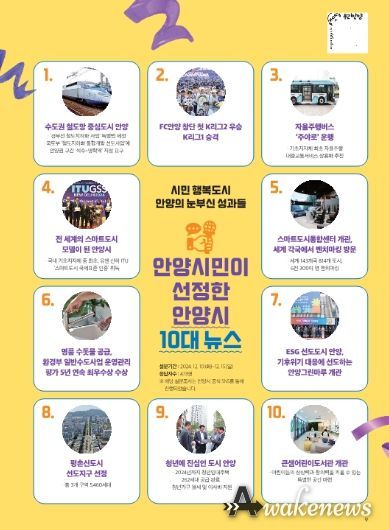 어웨이크뉴스 오경하 기자 | 안양시가 올해 시정 활동을 마무리하며 ‘2024년 안양시 10대 뉴스’를 선정했다고 31일 밝혔다.