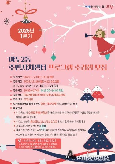 어웨이크뉴스 오경하 기자 | 고양특례시 일산동구 마두2동 주민자치회가 오는 20일부터 21일까지 이틀간 2025년 1분기 문화강좌 프로그램 강좌의 수강생을 추가 모집한다.