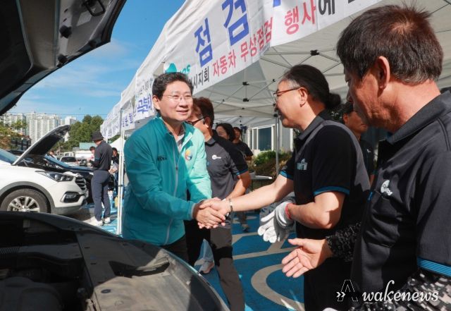 어웨이크뉴스 오경하 기자 | 이상일 용인특례시장은 21일 역북동 가상현실 스포츠체험센터 주차장에서 열린 장애인차량 무상점검 행사를 찾아 경기도자동차전문정비사업조합 용인시지회 조합원을 격려했다.