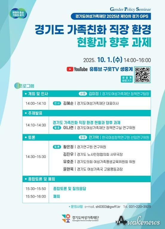 어웨이크뉴스 오경하 기자 | 경기도여성가족재단이 10월 1일 오후 2시 ‘경기도 가족친화 직장환경 현황과 향후 과제’를 주제로 정책토론회를 개최한다.