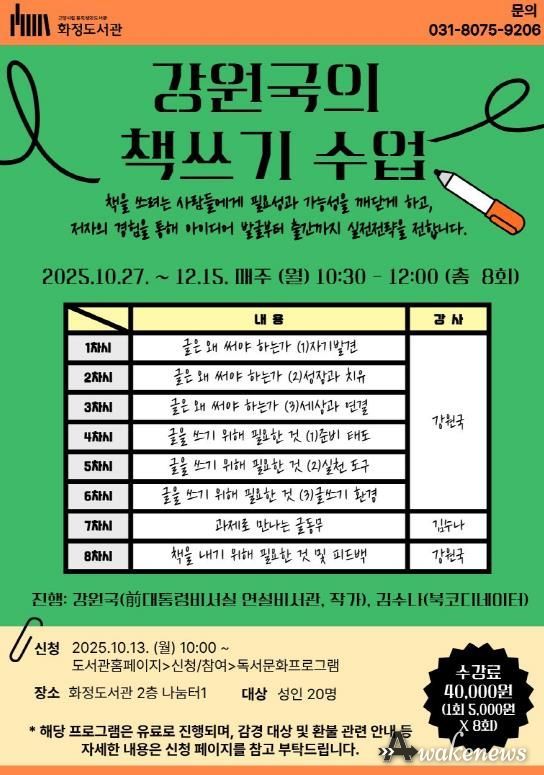 어웨이크뉴스 오경하 기자 | 고양특례시는 10월 27일부터 12월 15일까지 매주 월요일 오전 10시 30분부터 12시까지, 화정도서관 2층 나눔터1에서 ‘강원국의 책쓰기 수업’프로그램을 운영한다고 밝혔다.