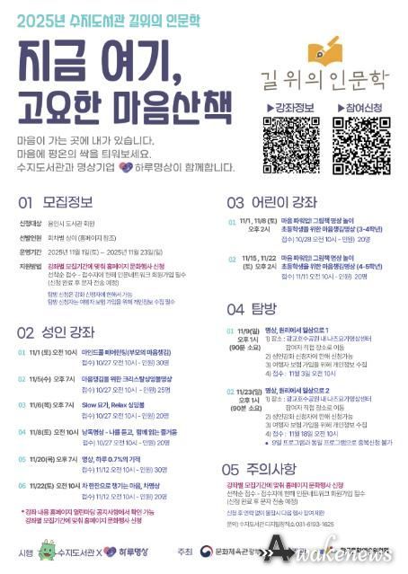 어웨이크뉴스 오경하 기자 | 용인특례시 수지도서관은 오는 11월 1일부터 23일까지 ‘2025년 길 위의 인문학’ 프로그램 ‘지금 여기, 고요한 마음 산책’을 운영한다고 17일 밝혔다.