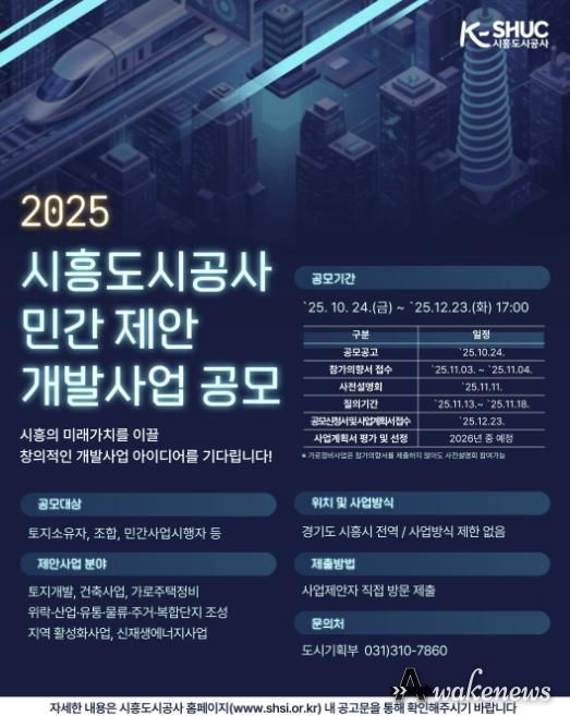 어웨이크뉴스 오경하 기자 | 시흥도시공사는 민간의 창의적인 개발 아이디어와 공사의 개발사업 역량을 결합하여, 신규 개발사업을 발굴하기 위한 ‘민간 제안 개발사업 공모’를 추진한다고 24일 밝혔다.
