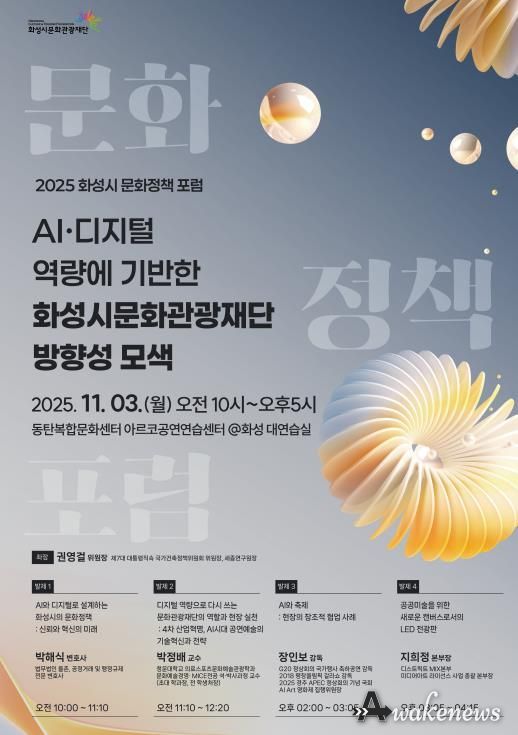 어웨이크뉴스 오경하 기자 | 화성시문화관광재단은 11월 3일(월) 오전 10시부터 오후 5시까지, 동탄복합문화센터 아르코공연연습센터@화성 대연습실에서 ‘2025 화성시 문화정책포럼’을 개최한다고 밝혔다.
