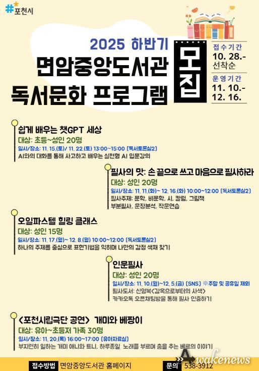 어웨이크뉴스 오경하 기자 | 포천시 면암중앙도서관은 오는 11월 16일부터 하반기 독서문화프로그램을 운영한다.