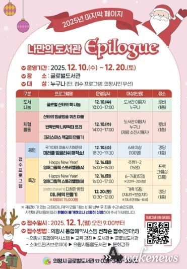 어웨이크뉴스 오경하 기자 | 의왕시 글로벌도서관(보식골로 30-10)에서는 올 한 해를 마무리하며 시민들이 풍성한 문화 향유 기회를 가질 수 있도록 연말 특별 행사'나만의 도서관 에필로그'를 12월 10일부터 20일까지 10일간 운영한다.