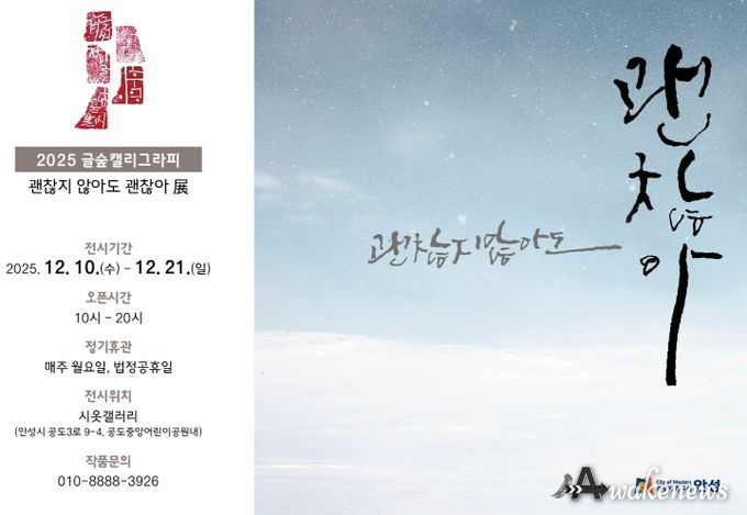 어웨이크뉴스 오경하 기자 | 공도 작은미술관 시옷갤러리는 오는 12월 10일부터 12월 21일까지 글숲 캘리그라피 작가들이 참여하는 전시 ‘괜찮지 않아도 괜찮아’ 전을 개최한다.