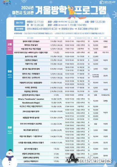 이번 겨울방학 프로그램은 이천시 관내 6개 공공도서관(시립·청미·어린이·효양·마장·서희도서관)에서 진행되며, 독서교실을 비롯해 작가와의 만남, 만들기 체험, 공연 등 다채로운 프로그램을 마련해 방학 기간 어린이들의 독서문화 활동을 지원하고 도서관 이용 활성화를 도모할 예정이다.