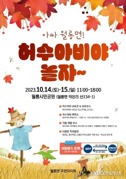 어웨이크뉴스 오경하 기자 | 파주시 월롱면 주민자치회가 주최 · 주관하는 ‘아싸 월롱면! 허수아비야 놀자~’ 축제가 오는 14일과 15일, 이틀에 걸쳐 파주 월롱시민공원(월롱면 덕은리 산 134-1)에서 개최된다.