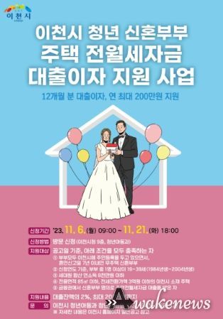 어웨이크뉴스 오경하 기자 | 이천시는 청년 신혼부부의 주거비 부담을 완화하여 안정적인 지역 정착을 지원하기 위해 주택전월세자금 대출이자를 지원한다고 밝혔다.