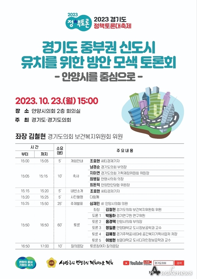경기도와 경기도의회가 주최하는 정책토론회가 23일(월) 오후 3시 안양시의회 소회의실에서 개최된다.