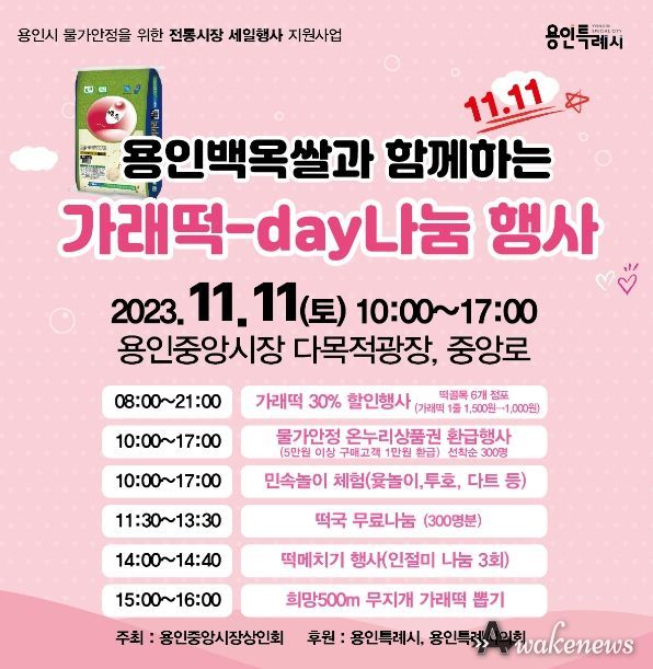 어웨이크뉴스 오경하 기자 | 용인특례시가 농업인의 날을 맞아 오는 11일 ‘용인중앙시장 가래떡데이 나눔 행사’가 열린다고 8일 밝혔다.