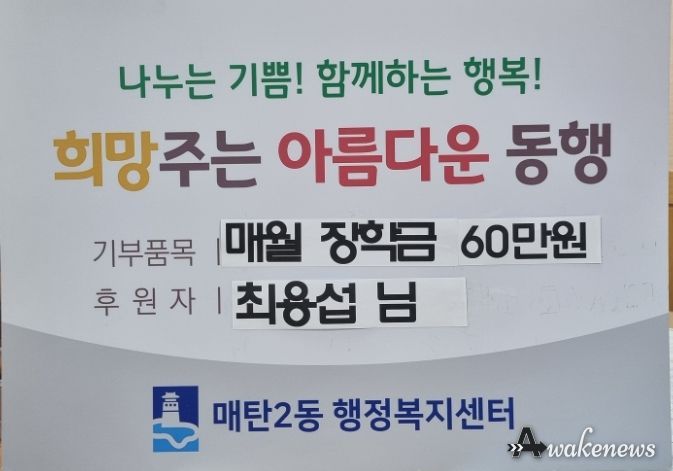 어웨이크뉴스 오경하 기자 | 지난 8일 매탄2동 독지가 최용섭씨는 매탄2동 행정복지센터에 관내 저소득 아동 3가구에 장학금 후원을 60만원 전달하며 앞으로 매달 장학금 후원을 계속할 뜻을 밝혔다.