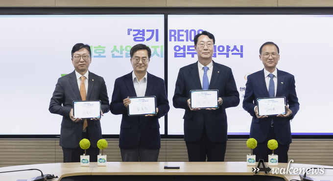 김동연 경기도지사는 15일 경기도청에서 정명근 화성시장, 김근영 화성도시공사 사장, 신동진 한화솔루션 인사이트 부문장(대표)과 ‘경기 RE100 산업단지(H-테크노밸리) 업무협약’을 체결했다.