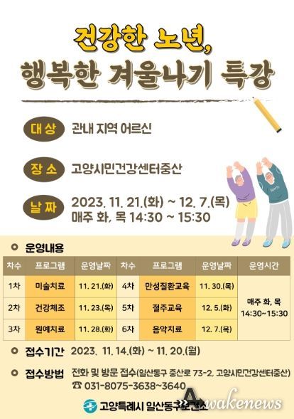 어웨이크뉴스 오경하 기자 | 고양시민건강센터 중산에서 겨울철 어르신의 만성질환 예방하기 위해 11월 20일부터 12월 7일까지 특별강좌 ‘건강한 노년, 행복한 겨울나기’를 운영한다.