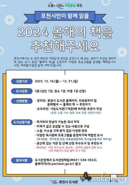 어웨이크뉴스 오경하 기자 | 포천시도서관은 오는 12월 18일부터 12월 30일까지 포천시민이 함께 읽을 ‘2024 올해의 책’ 후보 도서를 추천받는다고 밝혔다.