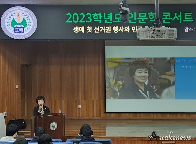 어웨이크뉴스 오경하 기자 | 경기도의회 교육기획위원회 황진희 의원(더불어민주당, 부천4)은 12월 19일(화) 부천시 소재의 정명고등학교에서 추진한 「2023 인문학 아카데미 명사 초청 특강」에서 ‘생애 첫 선거권 행사의 의미와 민주시민’이라는 주제로 특강을 실시했다.