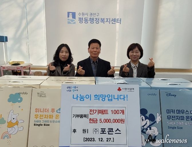 어웨이크뉴스 오경하 기자 | 권선구 고색동 소재 기업 ㈜포콘스(대표 정낙환)는 지난 27일 연말연시를 맞아 어려운 이웃이 따뜻한 겨울을 보낼 수 있도록 전기매트 100매(560만원 상당)와 이웃돕기 성금 500만원을 평동 행정복지센터에 전달했다.