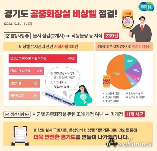 경기도는 지난해 10월 31일부터 11월 27일까지 도내 31개 시군을 대상으로 공중화장실 비상벨 관련 설치 조례 개정과 유지관리 실태 점검을 실시한 결과 239건의 부적합 사례를 적발했다고 11일 밝혔다.