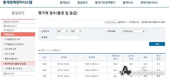 어웨이크뉴스 오경하 기자 | 안성시 사회조사(국가통계 승인번호 제632002호) 자체통계품질진단 결과 2년 연속 '우수'등급을 달성했다.