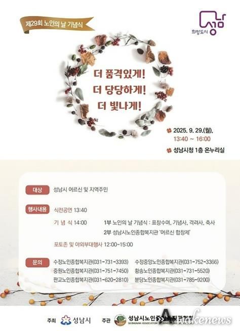 어웨이크뉴스 오경하 기자 | 성남시는 ‘제29회 노인의 날(10.2)’을 맞아 오는 9월 29일 오후 1시 40분 시청 1층 온누리에서 “더 품격있게! 더 당당하게! 더 빛나게!”를 주제로 기념행사를 연다.