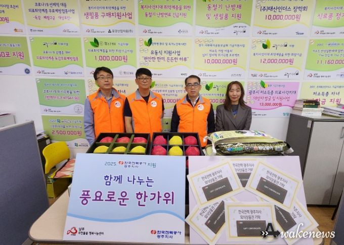 어웨이크뉴스 오경하 기자 | 한국전력공사 광주지사는 1일 광주시 남부 무한돌봄 행복나눔센터를 방문해 지역 내 취약계층을 위한 120만 원 상당의 물품(식료품, 외식상품권 등)을 기탁했다.
