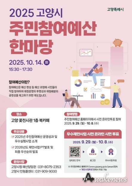 어웨이크뉴스 오경하 기자 | 고양특례시는 오는 10월 14일 오후 3시 30분, 일산호수공원 고양꽃전시관(북카페)에서 ‘2025년 고양특례시 주민참여예산 한마당’을 개최한다고 밝혔다.