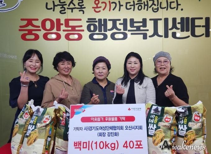 어웨이크뉴스 오경하 기자 | 사단법인 경기도여성단체협의회 오산시지회는 지난 10월 1일, 추석 명절을 앞두고 지역 내 어려운 이웃을 위해 백미(10kg) 5포씩을 오산시 관내 8개 동 행정복지센터에 각각 기탁했다.