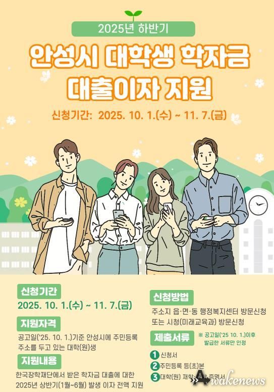 어웨이크뉴스 오경하 기자 | 안성시는 오는 10월 1일부터 11월 7일까지 ‘2025년도 하반기 안성시 대학생 학자금 대출이자’ 지원 신청을 받는다.